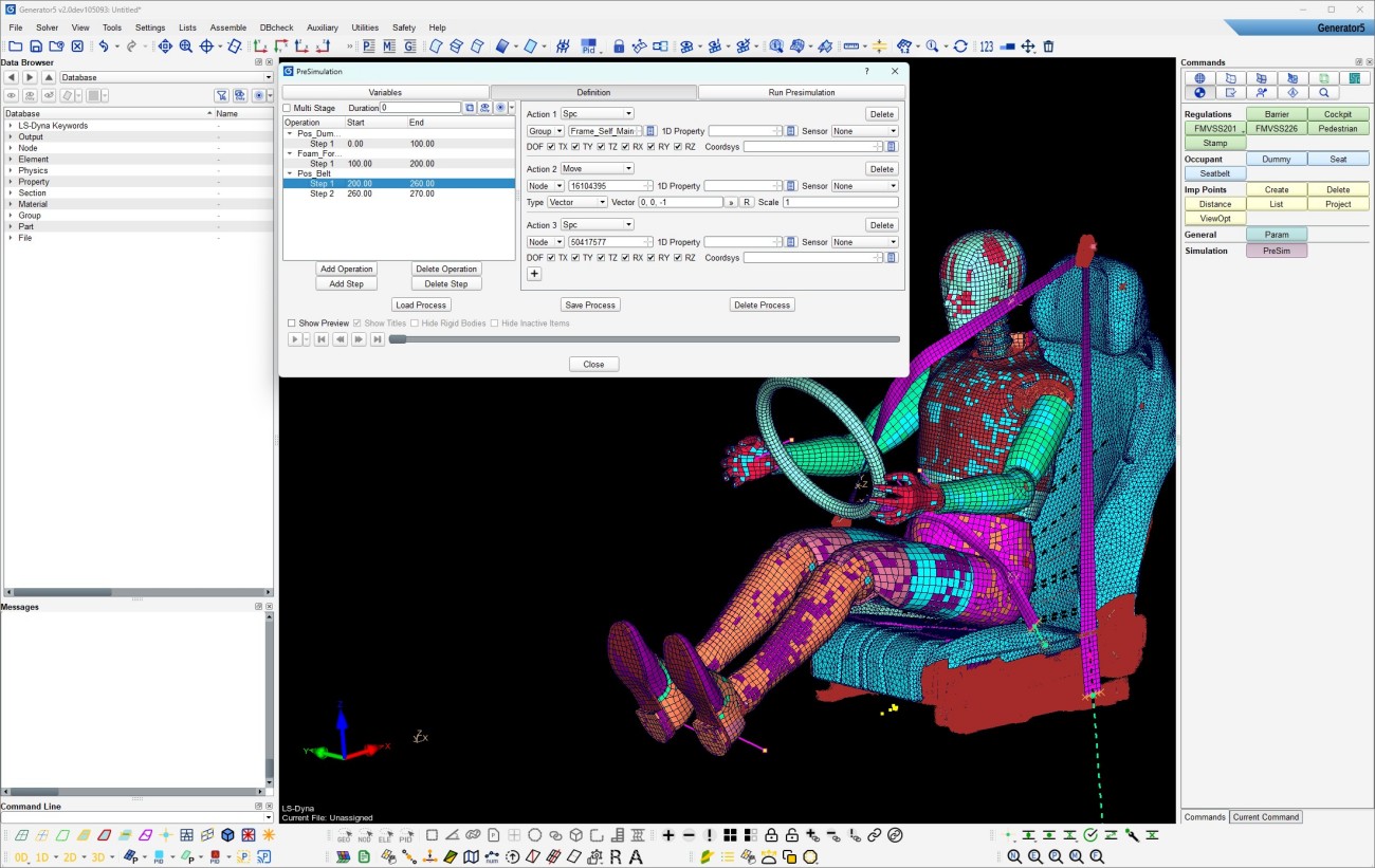交互式操作设定预模拟,内嵌各类控制动作,适用假人、座椅、安全带等部件的预模拟定位,也可用于气囊折叠等的多步加载工况